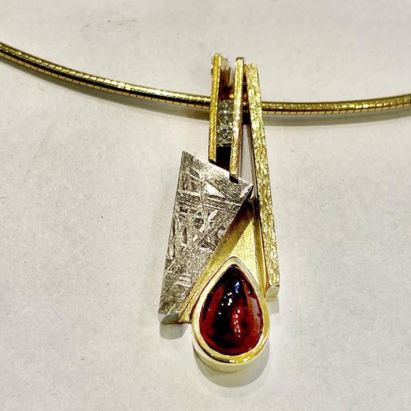 Anhänger 14 kt Gelbgold und Weißgold, roter Turmalin, Prinzess Karree Diamanten 0,10 ct und 1 Meteorit