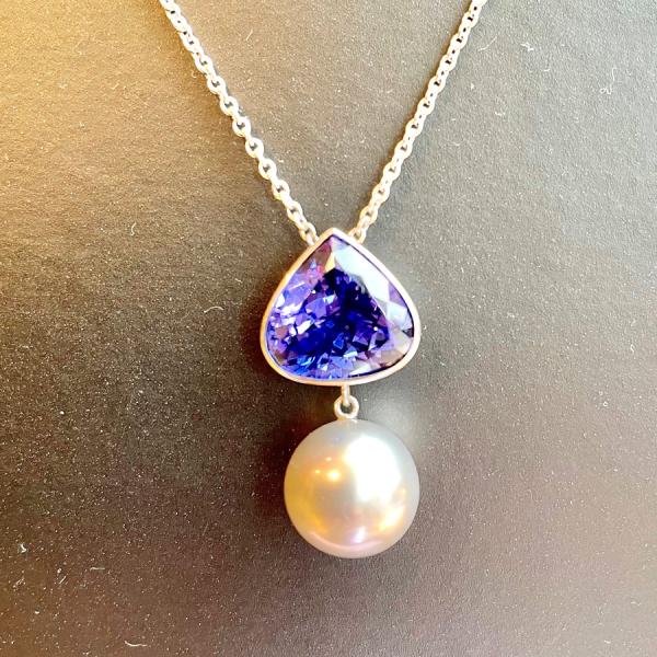 Anhänger 14 kt Weißgold, Tansanit Tropfen - Tahiti Perle inclusive Weißgoldkette